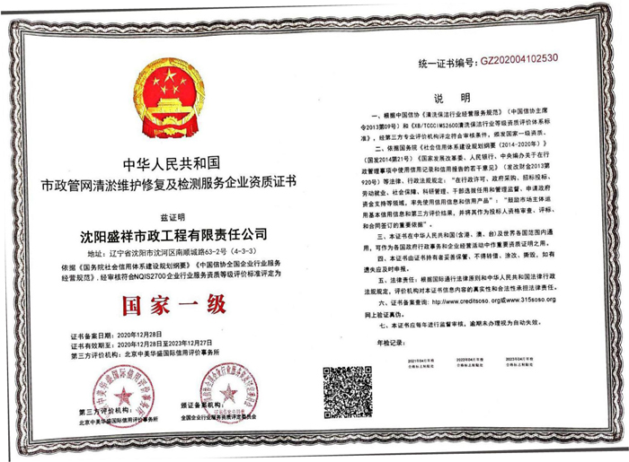 市政管道清淤維護(hù)修復(fù)及檢測(cè)服務(wù)國(guó)家一級(jí)證書
